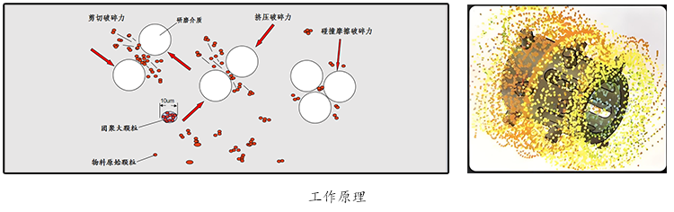 2.2、研磨物料在離心力的作用下,緊貼到研磨桶內(nèi)壁上收到相鄰介質(zhì)的壓力和剪切力發(fā)生分散與破碎。